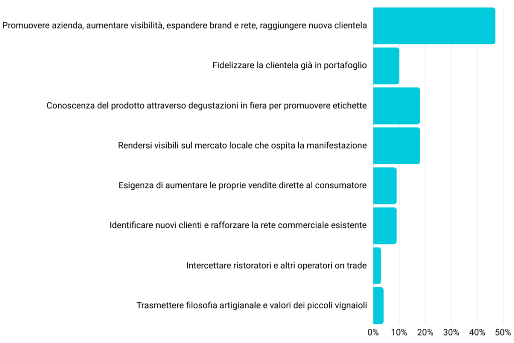 Il 47% delle risposte, aggregate per affinità, porta come motivazione principale quella di farsi conoscere, dare visibilità alla propria azienda, diffondere il proprio brand, raggiungere nuova clientela, espandere la propria rete di contatti. Il 10% delle aziende affianca la finalità di fidelizzare la clientela già in portafoglio. A questo proposito, conservare la fiducia di un cliente già in portafoglio può essere molto meno costoso di cercarne di nuovi: la customer retention è una leva che le aziende del vino devono sforzarsi di manovrare con maestria, soprattutto in un momento come quello attuale, caratterizzato da volatilità e imprevedibilità.